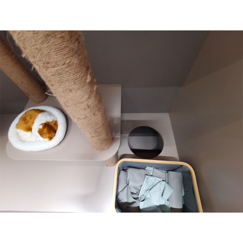 يمكن لقططك القفز والنوم في هذا المكان المخصص للحيوانات الأليفة ، وهناك ثلاث خزانات تحت شجرة القطط لتخزين فضلات القطط والطعام والألعاب وما إلى ذلك. يقع الجزء السفلي من الخزانة على بعد مسافة من الأرضية لاستيعاب مكنسة أرضية أو أشياء صغيرة أخرى. ستجعل هذه الخزانة منزلك أكثر ترتيباً وستمنح قطتك مساحة أكثر راحة.
