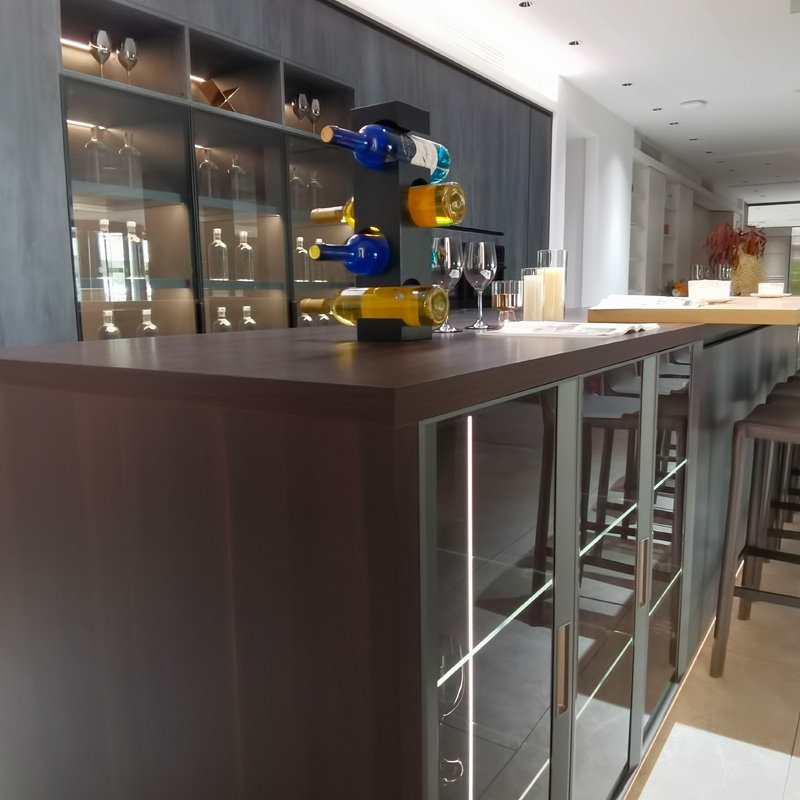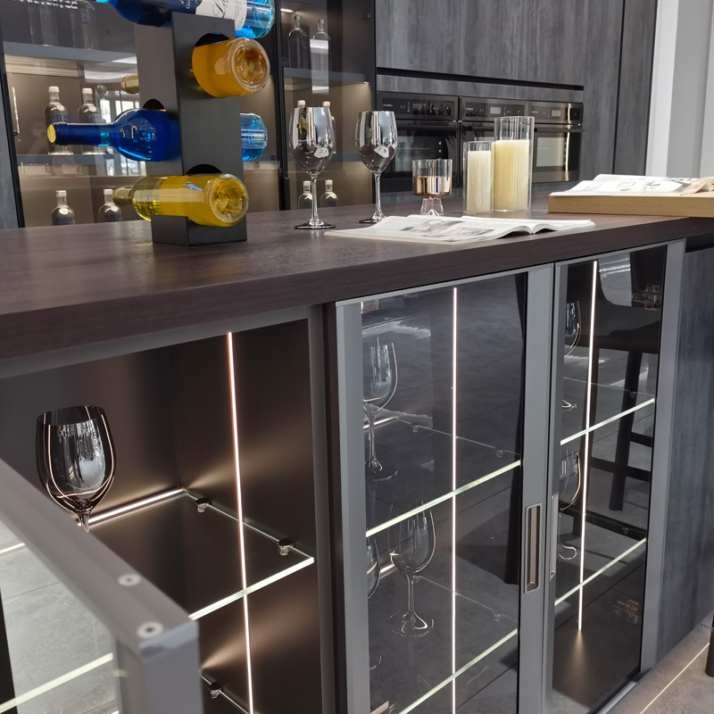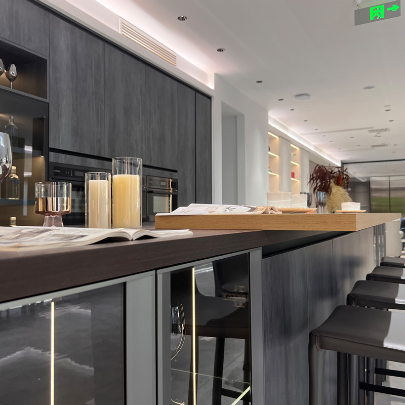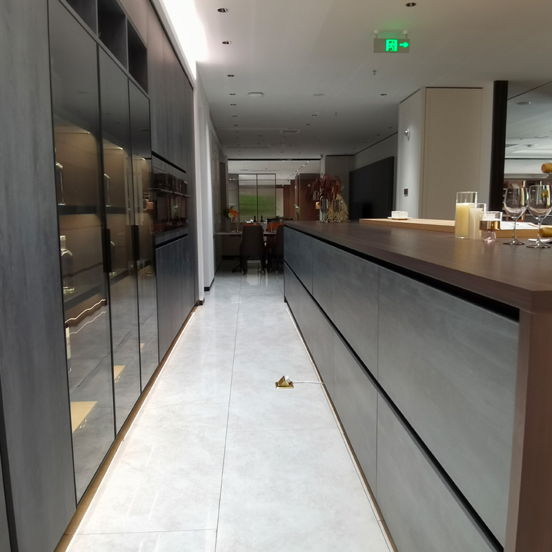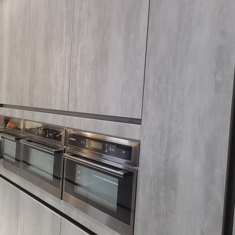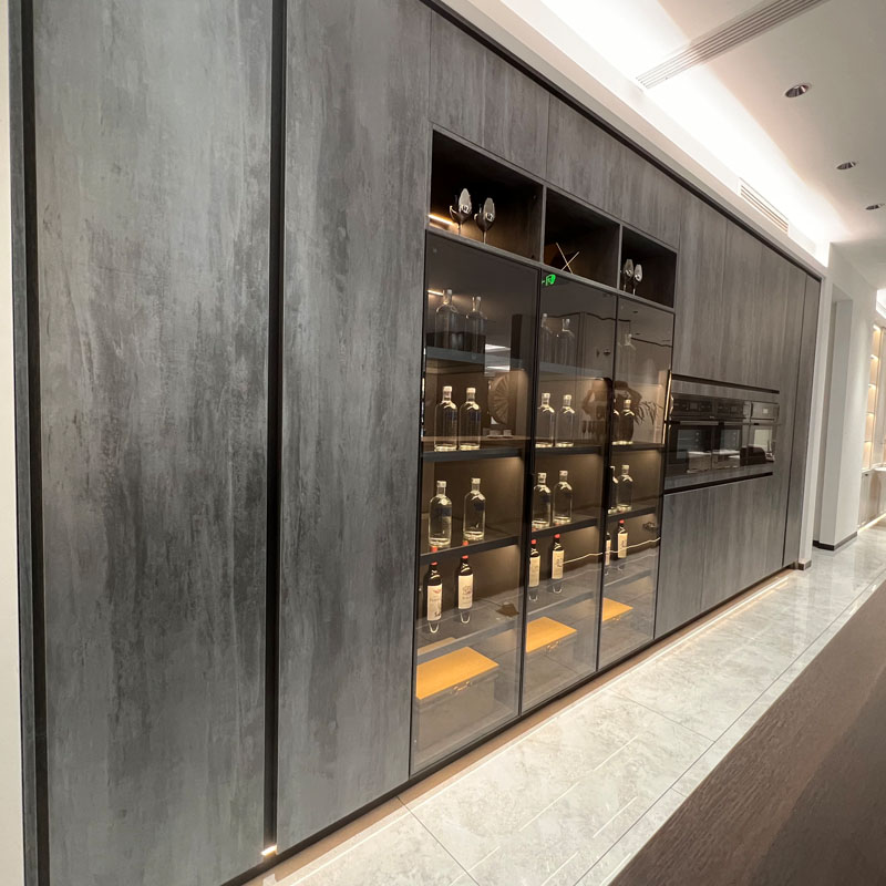خزانة مطبخ مغلفة بأسلوب جديد صناعي مع معالجة قديمة للألوان مثل التجوية الصخرية ، شعور اللمس سلس وجودة ، لوحة باب زجاجية متطابقة مع إطار من الألومنيوم ، تجعل التأثير العالي لتأثير ديكور المطبخ. المواد مقاومة للماء سهلة التنظيف والأناقة ليست سهلة.